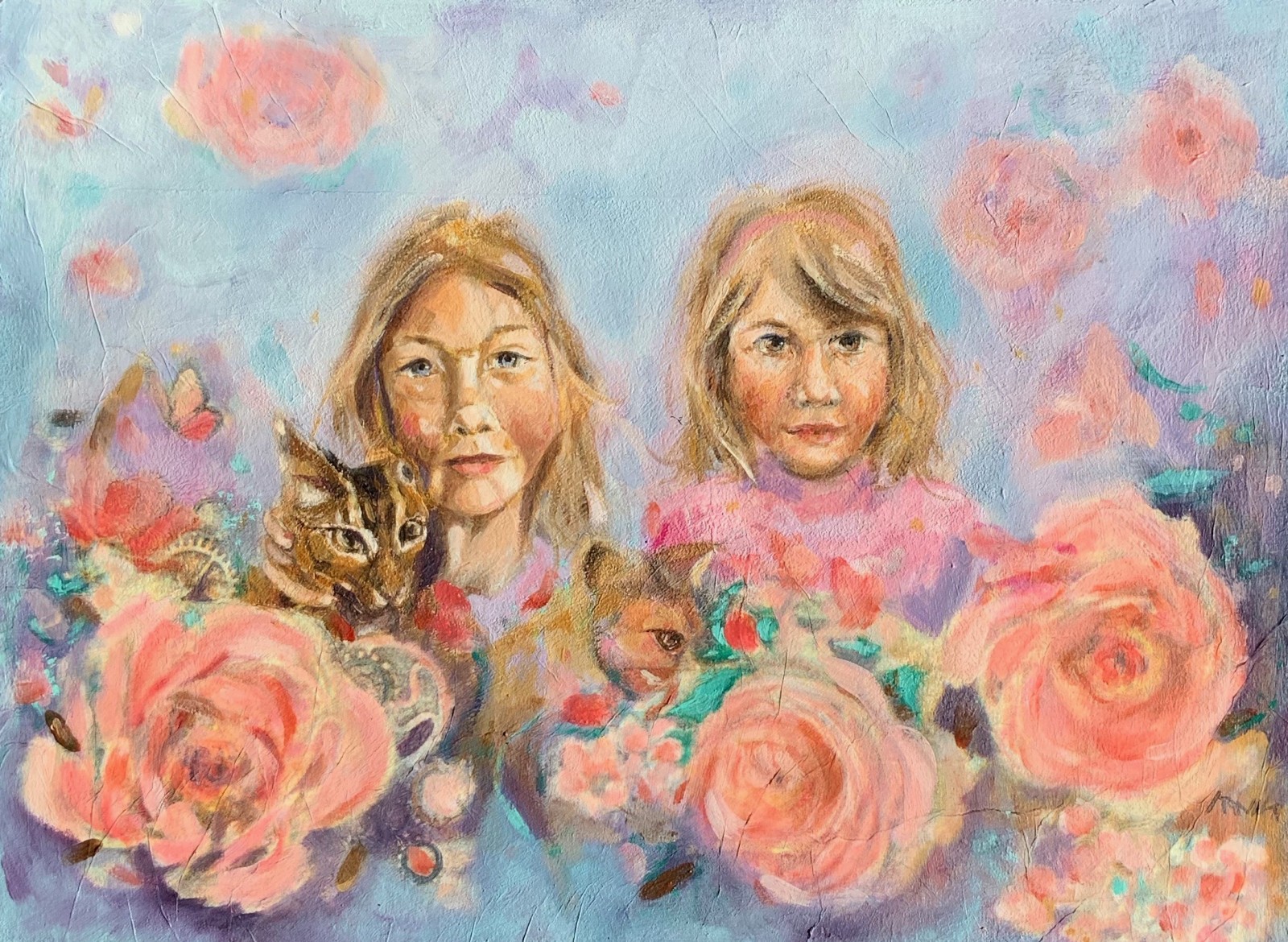 Siostrzyczki, akryl, olej, decoupage, 2020